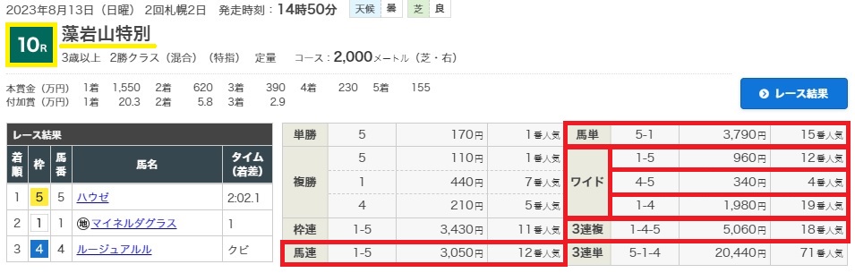 8月13日(日)札幌10R無料情報・合計『151.8倍』的中