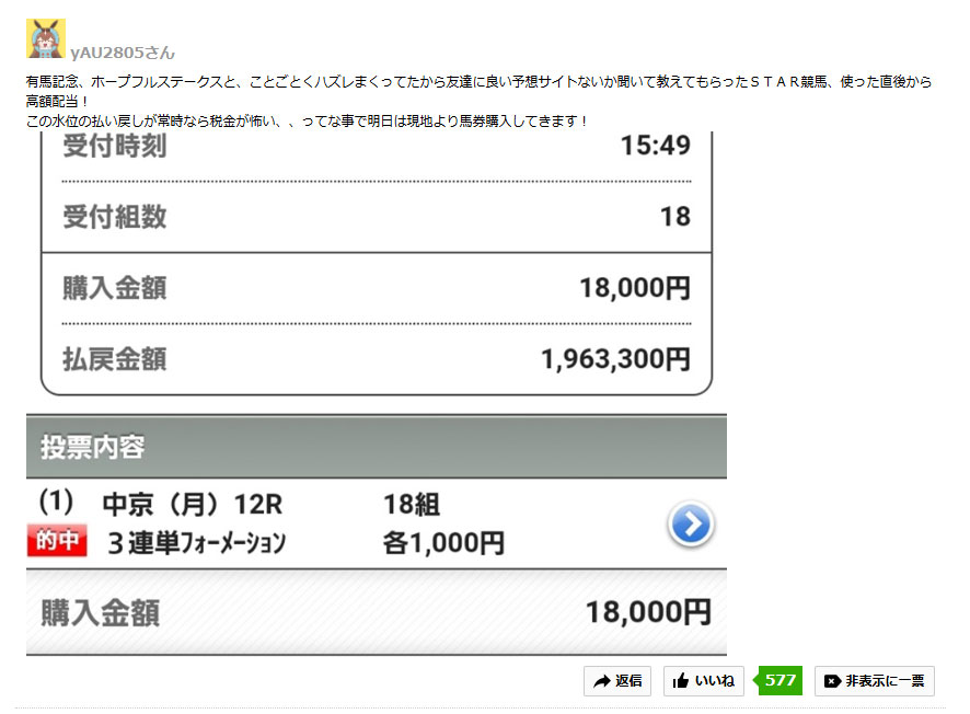 そんな中、【えーあい】とは真逆にAJCC(G2)で3連単を的中させていたサイトを発見したのでご紹介させていただきます!