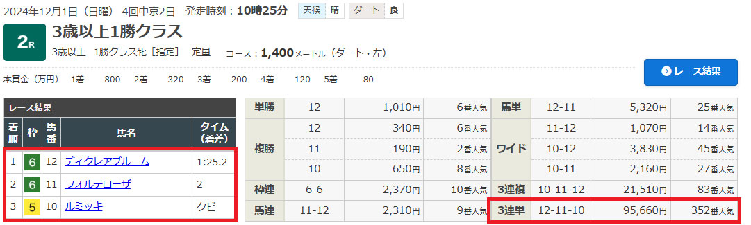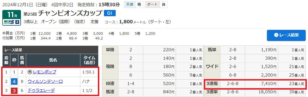 1番人気の②レモンポップが1着で、⑥⑧と2頭ともに選んでいたので的中しました。