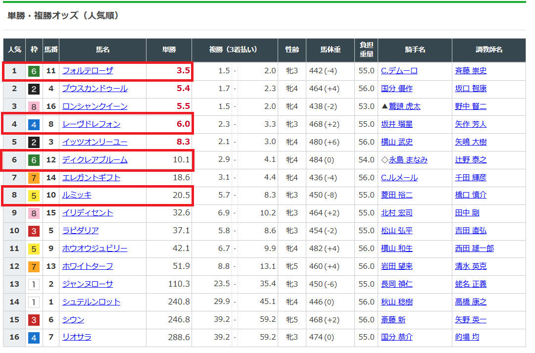 馬券は中でも数字の高い②レモンポップから5頭の3連複ボックスで買うことにします。