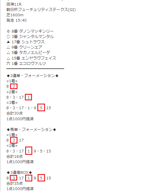 12月17日(日)阪神11R朝日杯FS(G1)で無料情報3連単129.1倍含む3馬券種的中!
