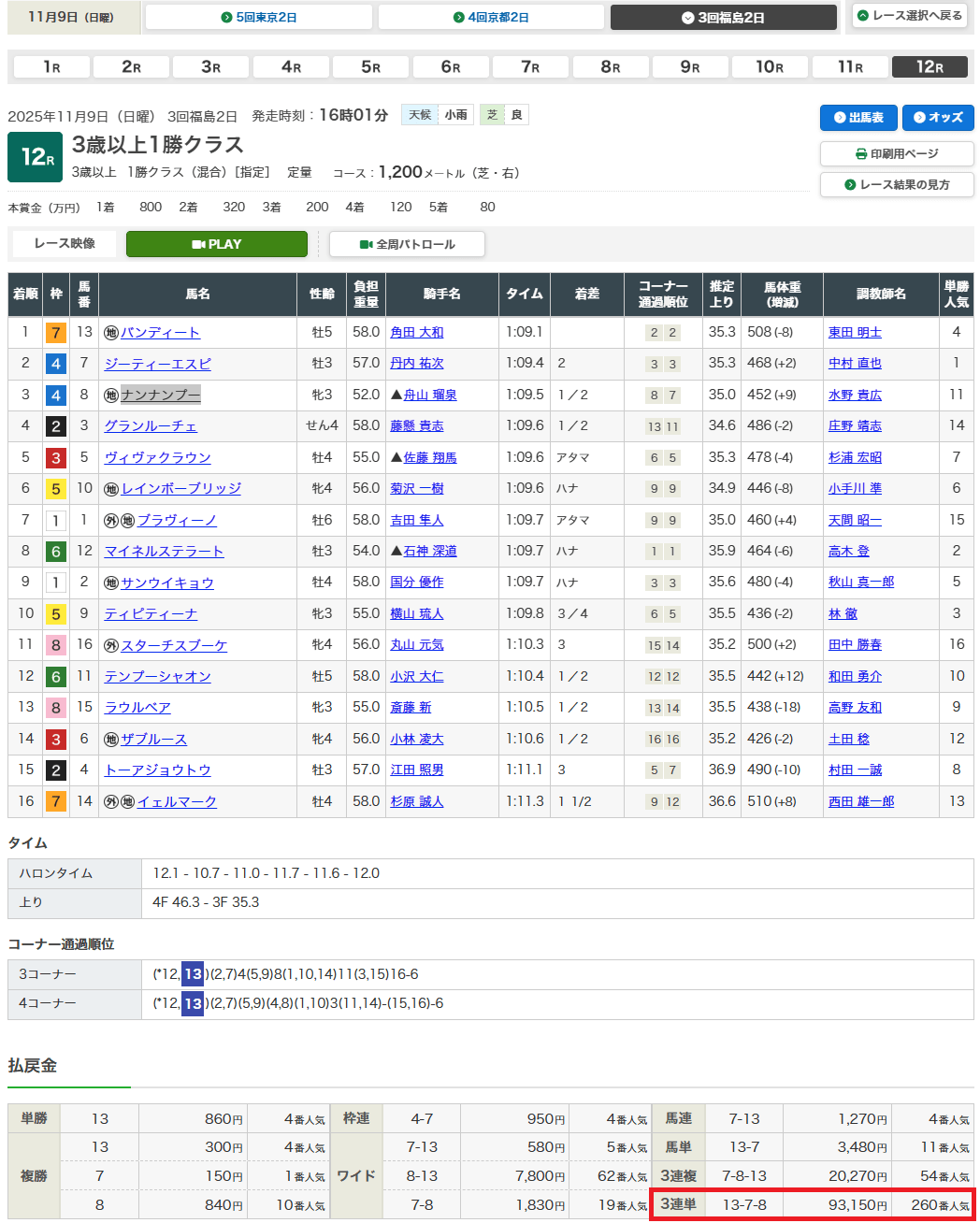 11月16日・東京8レース 3歳以上2勝クラス 芝1800m