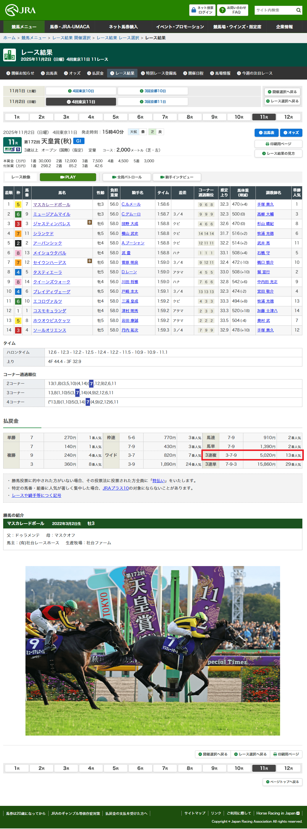 実績馬が集う天皇賞という事もあり配当は先週の菊花賞以上という事はできませんでしたがしっかりと的中をお届けできました。