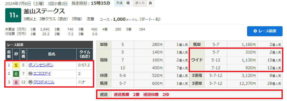 1番人気、2番人気の5-7のワイドだけ的中で3.1倍なので3,100円と②番が返還になりその②の絡んだ4通りの馬券分が返還されました。