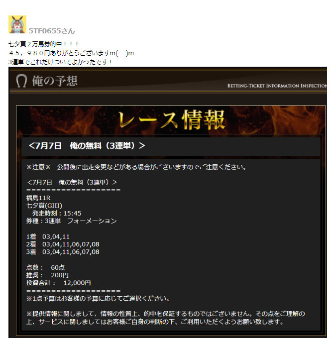 見事無料情報で七夕賞(G3)の3連単を当てたようです。