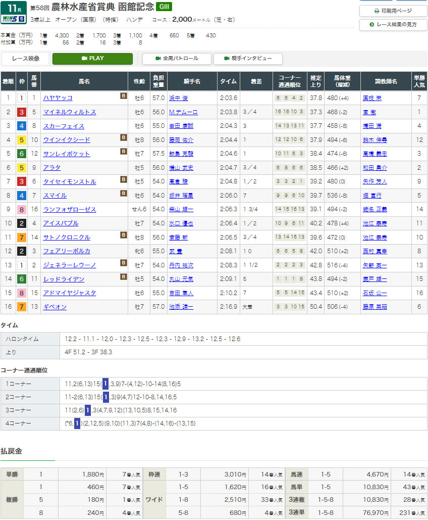 函館12R/ワイド③-⑨(7.2倍)③-⑥(24.2倍)⑥-⑨(11.7倍)全不的中