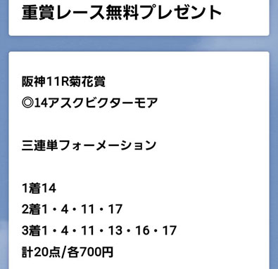 実際に重賞プレゼントで菊花賞の予想を出していたのでこちらも購入してみました。
