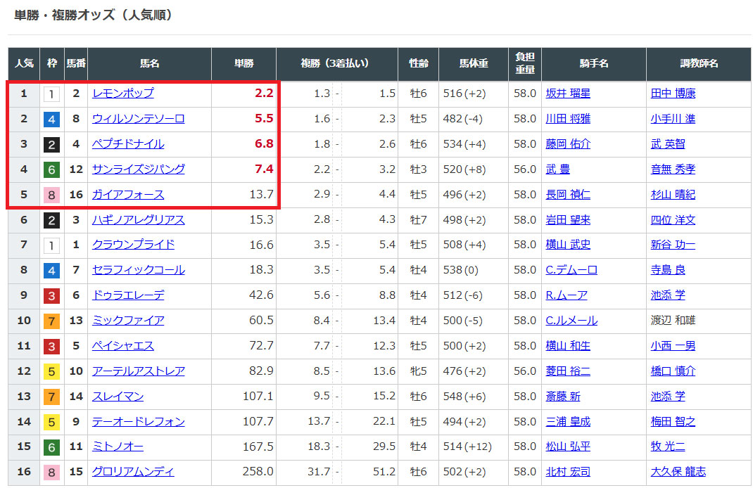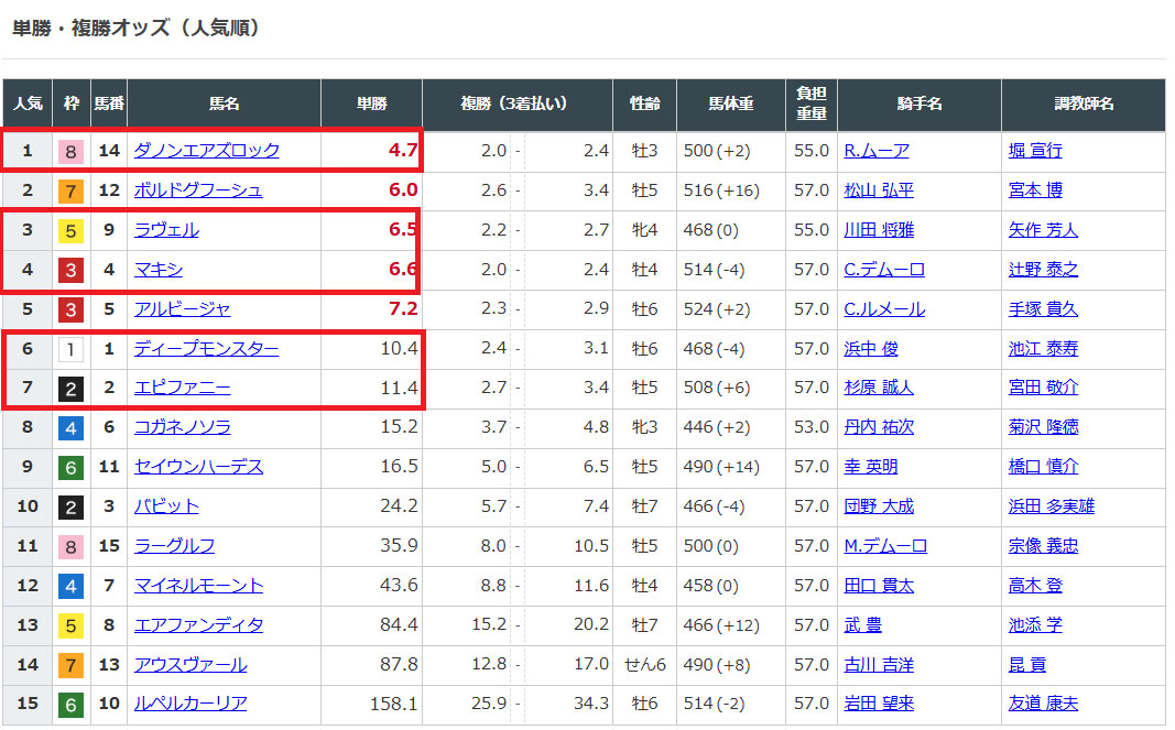 1、3,4,6,7番人気と比較的人気馬を選んでいます。