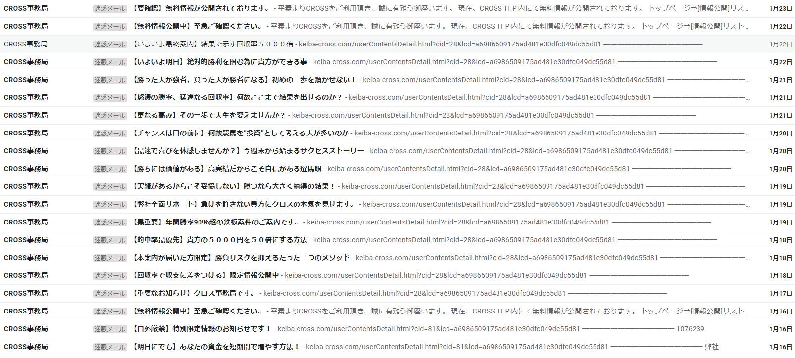 いつだか知らないサイトからメールが届くようになり、受信メールを調べたらどうやら【2021年1月16日(火)】から悪徳勧誘メールが来ていました。
