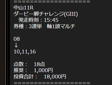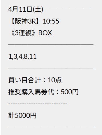 先週の大阪杯のレビューみて利用してみました。 3連単推奨でしたけど3連複でも充分配当あったのでよかったです。 さすがの本命馬でしたね、これとは別に馬単ももらいました。 ありがとうございます