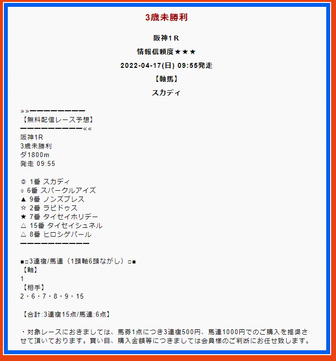 有料情報で不的中でした。お金かけてるのにこれはひどいな… もう二度と利用しません。