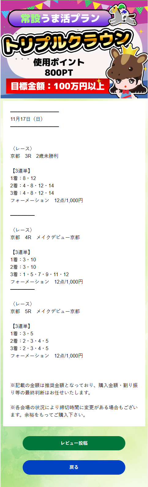 結論からいうと3レース3連続的中! 尻下がりで配当は少なくなっていったけど一発目の的中がでかすぎた! 京都3R⇒1295倍 京都4R⇒35.1倍 京都5R⇒60.6倍 合計払い戻し:139万700円! 最高過ぎました!