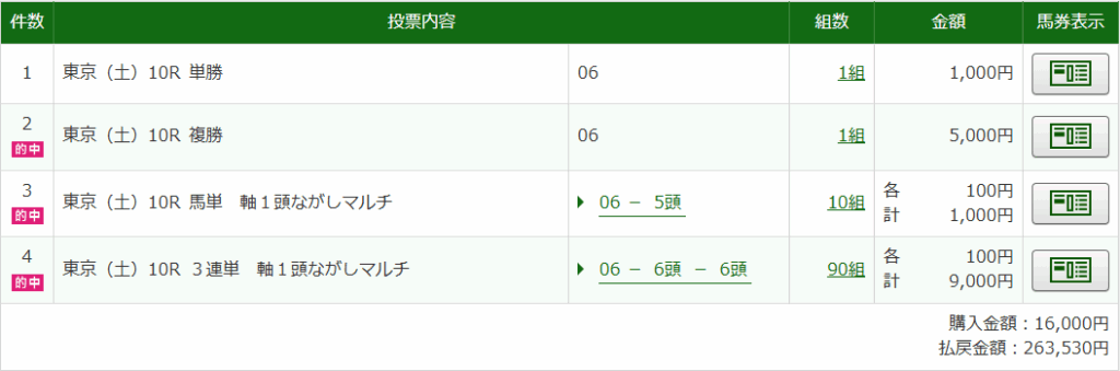 今回の結果は回収率4647%、馬券代差し引いての利益21万8260円という素晴らしい結果でした。