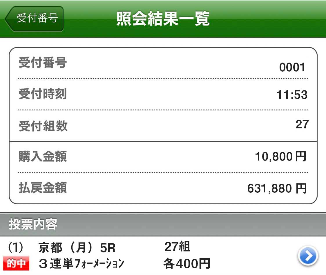 無料情報、結果が①→⑦→④でした。 土日このサイトで稼がせてもらったから3連複の買い目にプラスして3連単も1点400円で購入してました。 9人気④の激走見抜けたの凄い。 3連複→60.9倍×400円=24,360円 3連単→200.8×400円=80,320 トータル104,680円って感じでした。